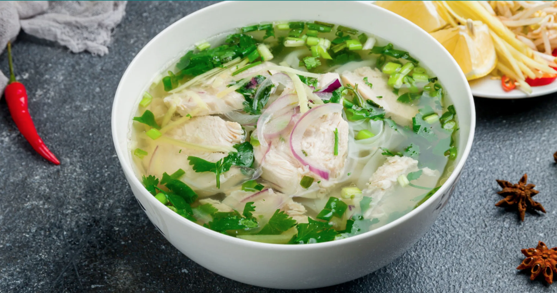 Traditionelle vietnamesische Hühnersuppe mit klarer, aromatischer Brühe aus Rinderknochen, Suppenhuhn, Ingwer und Gewürzen. Serviert mit Reisbandnudeln, zartem Hähnchenfleisch oder Tofu, frischer Minze, Lauchzwiebeln, roten Zwiebeln, Limette, Ingwerstreifen und auf Wunsch frischer Chili