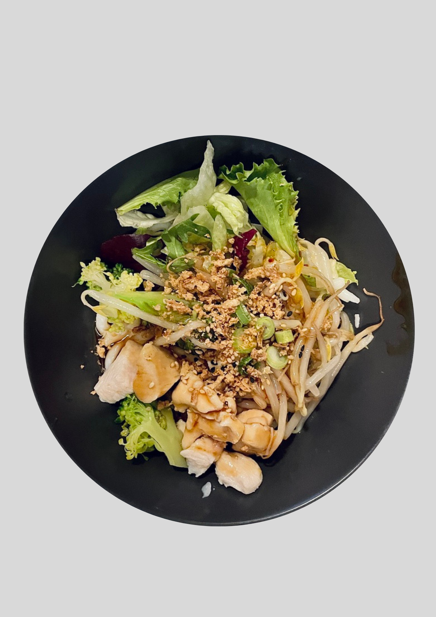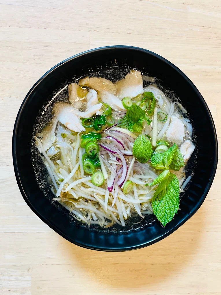 Traditionelle vietnamesische Hühnersuppe mit klarer, aromatischer Brühe aus Rinderknochen, Suppenhuhn, Ingwer und Gewürzen. Serviert mit Reisbandnudeln, zartem Hähnchenfleisch oder Tofu, frischer Minze, Lauchzwiebeln, roten Zwiebeln, Limette, Ingwerstreifen und auf Wunsch frischer Chili