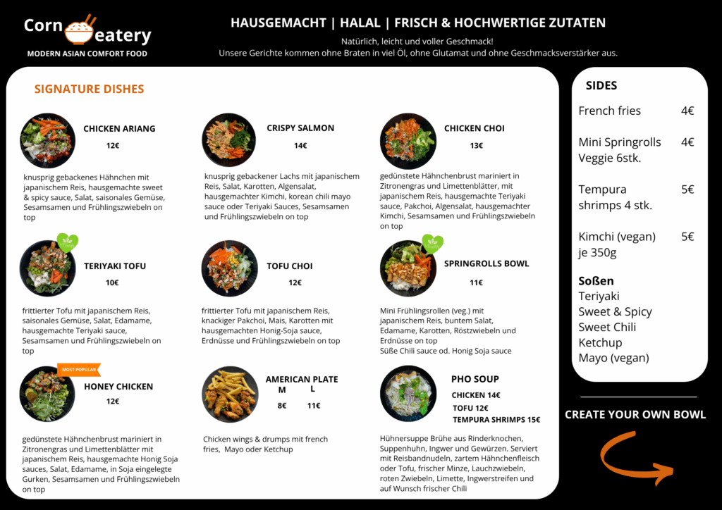 „Bei Corn Eatery bereiten wir jedes Gericht mit hochwertigen Zutaten, hausgemachten Soßen, ganz ohne Geschmacksverstärker oder Fertigprodukte zu – Halal Fleisch, Vegan Tofu, crispy´s Chicken, Lachs und Kimchi sind selbst gemacht“